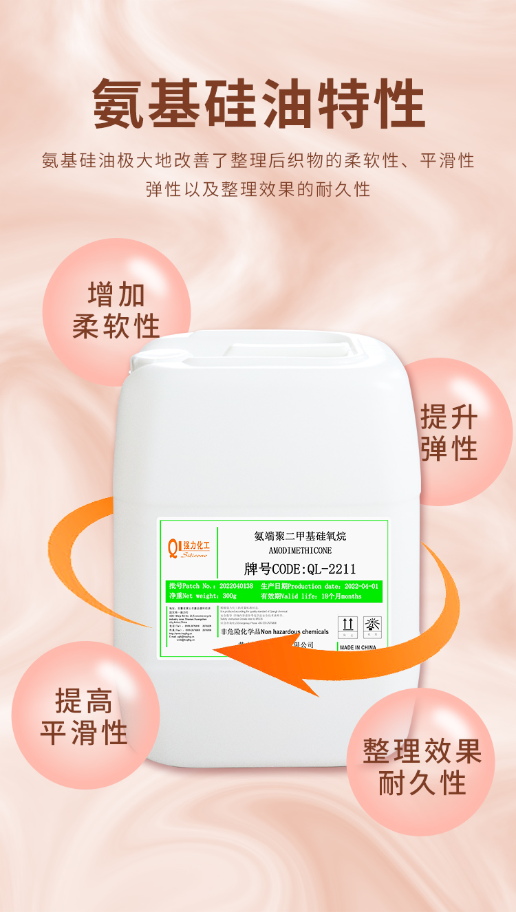 氨基硅油是專門(mén)用于紡織品柔軟整理劑的基本成份.它具有最佳的吸附性、相容性及易乳化性.使用混合器或均質(zhì)機(jī),氨基硅油容易被適當(dāng)?shù)谋砻婊钚詣┤榛煞€(wěn)定、透明的微乳液.它可以單獨(dú)使用,也可以與其它有機(jī)硅或有機(jī)柔軟劑組合成為特殊的柔軟整理劑,適用於各種紡織品的柔軟整理。