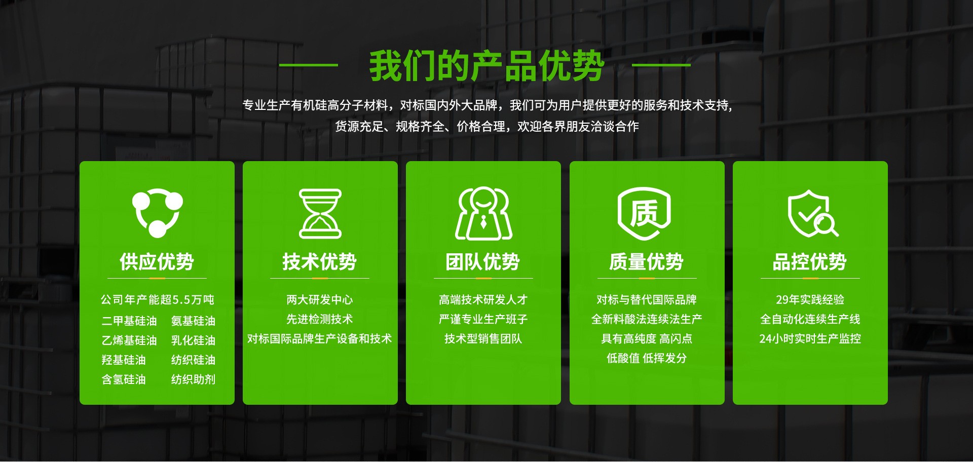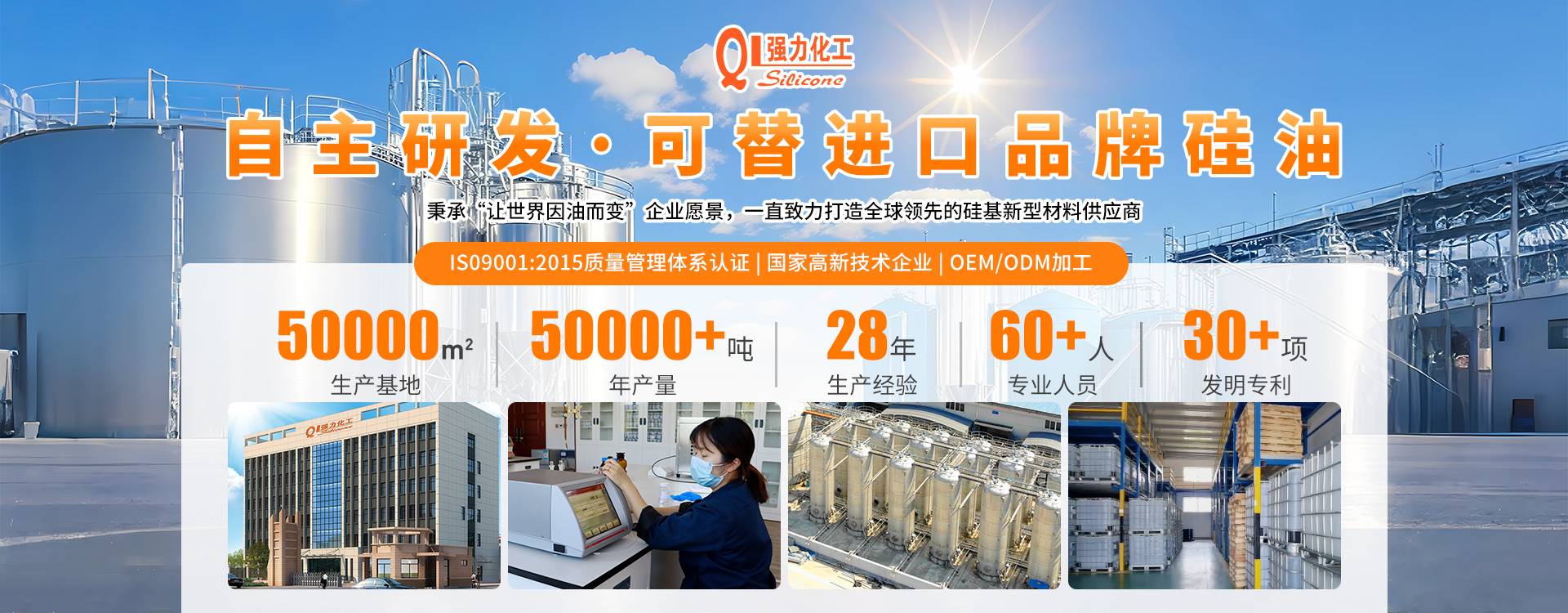 強(qiáng)力化工是一家專注于有機(jī)硅新材料,集研發(fā)、生產(chǎn)與銷售為一體的綜合性高新技術(shù)企業(yè)。公司坐落于歙縣循環(huán)經(jīng)濟(jì)園區(qū),占地面積50余畝,現(xiàn)有機(jī)硅產(chǎn)能已達(dá)5.5萬(wàn)噸。公司已是有機(jī)硅行業(yè)內(nèi)較為知名的品牌,傾力于打造高品質(zhì)有機(jī)硅產(chǎn)品:二甲基硅油、乙烯基硅油、氨基硅油、乳化硅油、羥基硅油、紡織品硅油等。公司砥礪前行,踔厲奮發(fā),強(qiáng)力純硅油,更高技術(shù),更好硅油。秉承“讓世界因硅而變”企業(yè)愿景,一直致力打造全球領(lǐng)先的硅基新型材料制造商。