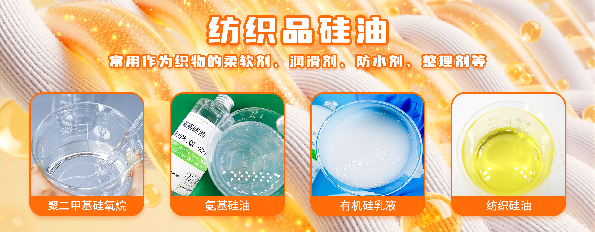 主要產(chǎn)品:紡織油劑、紡織硅油、抗靜電劑、交聯(lián)劑等。